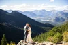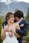 A bride and groom embrace in front of a mountainous landscape with red rocks and snow-capped peaks in the background.